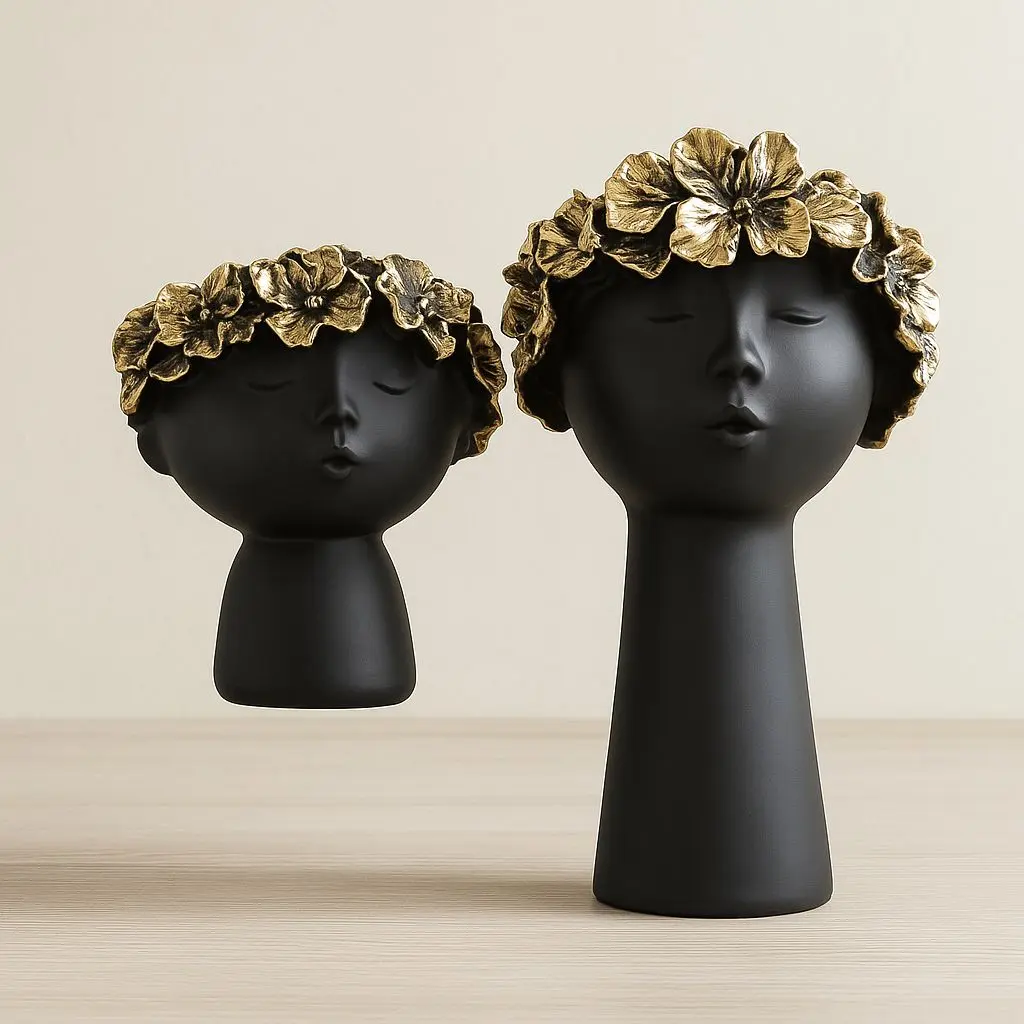 Black Girl Flower Head Sculpture, Modern Matte Decor Bust with Golden Floral Crown | Minimalist Tabletop Statue for Home, Office, Shelf