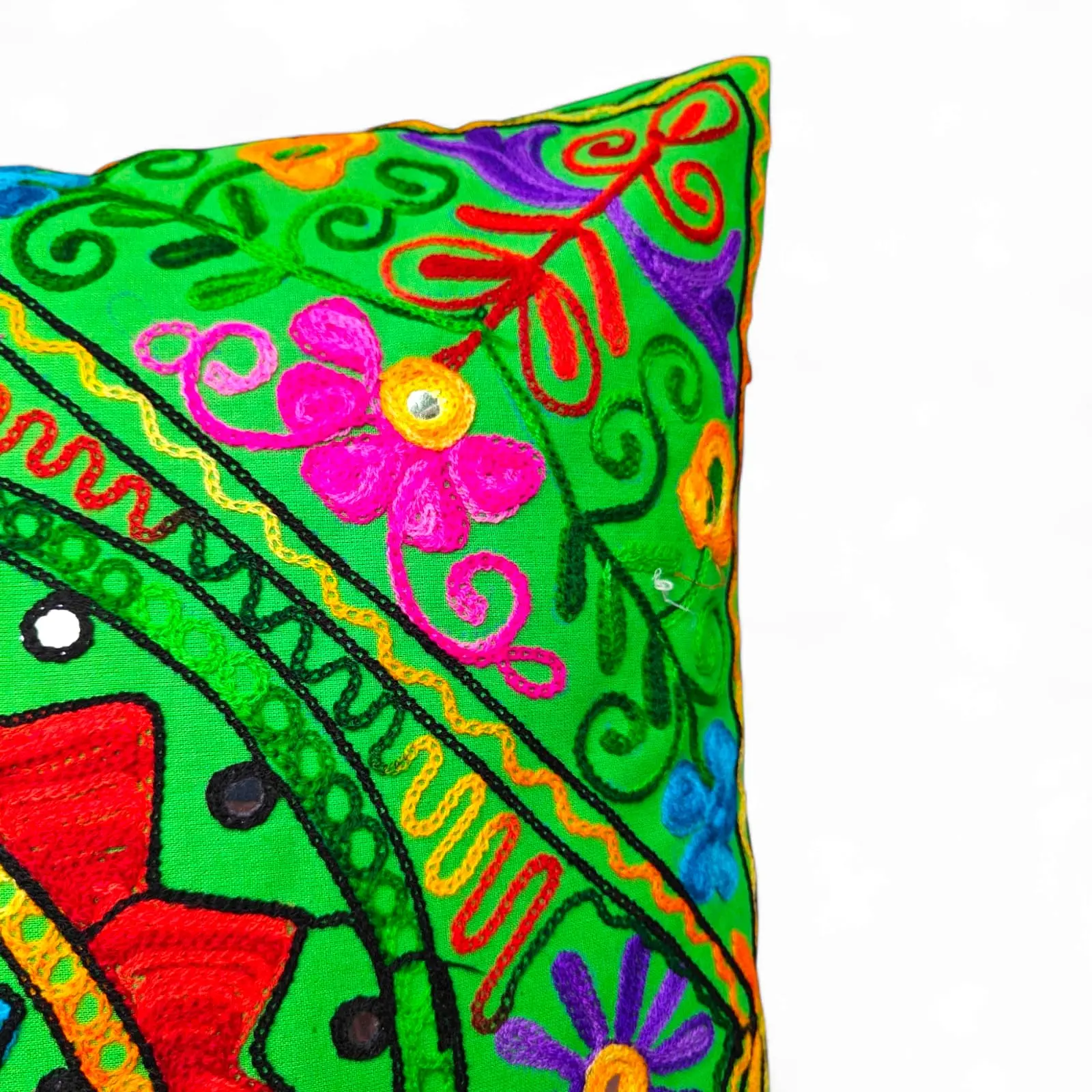 Bring a burst of vibrant tradition into your home with this handcrafted Indian cushion cover, featuring rich multicolor floral embroidery in the classic Suzani style. Made with premium grey cotton fabric, this piece adds charm and elegance to any sofa, majlis, or bedroom décor.